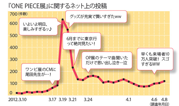 『ONE PIECE展』開幕直前から、ブログ・Twitterでの投稿が急上昇! 今後も全国的な注目が集まることが予想される。ぴあ調べ(2012.3.8~2012.4.8)調査協力:サイバーコミュニケーションズ 拡大画像表示