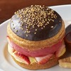 “マシュマロマン”をイメージしたデザートバーガー。真っ白なバンズにメガマシュマロとヨーグルトアイスクリーム、ブラックココアクッキーやラズベリー&ビーツのブラッドベリーソースを合わせました。