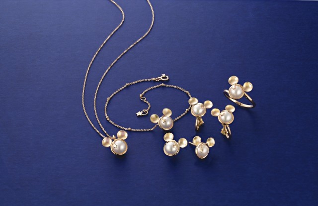 リング、ネックレス、ブレスレット、イヤリング、ピアスは、それぞれアコヤパールが使用されており、ミッキーマウスのモチーフと星のデザインがポイントです。