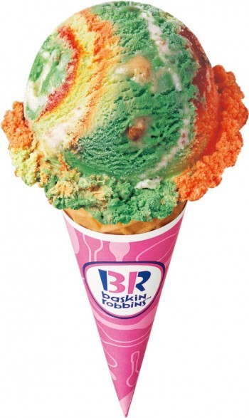 緑色のアボカドココナッツアイスクリームとオレンジ色のアマゾンフルーツアイスクリームに、酸味のある赤いトロピカルフルーツと濃厚な白いココナッツの2種類のリボンを合わせたもの。
