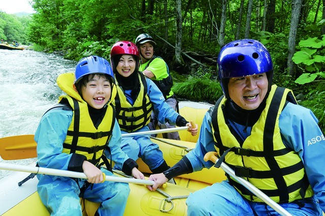 空知川の緩やかなコースをゴムボートに乗って川下りにチャレンジ。経験豊富なリバーガイドが一緒なので、ファミリーでも安心して楽しめる。