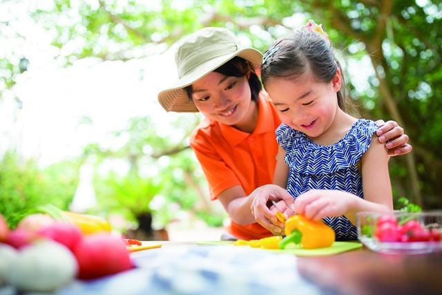 小浜島の東側に位置する「星野リゾート リゾナーレ小浜島」ホテルは自慢のサンゴ礁の碧いビーチを楽しめるほか、島内探検にクッキング、工作体験といった様々なアクティビティが揃っているので、子どもの興味に合わせた体験ができるのもうれしい。
