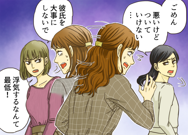 焦った女性は、ほかの友人に助けを求めようとしますが、そのとき知ったのは「付き合うなら責任を持てって言ったのに、彼氏を大事にしないで浮気するなんて最低」とみんなが言っていることで、誰も彼女と話そうとはしてくれない現実でした。