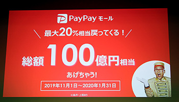 ヤフーは11月1日から、オンラインショッピングモール「PayPayモール」で買い物をすると、会計金額の最大25%相当が、スマートフォン(スマホ)決済サービス「PayPay」の電子マネー「PayPay残高」などで戻ってくるキャンペーン「PayPayモールで100億円相当あげちゃうキャンペーン」を実施する。期間は2020年1月31日まで。付与総額は100億円相当としている。