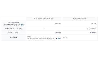 一方、タブレットプラン20は月間データ容量20GBまで使えるタブレット端末単体の契約となり、税別の月額料金が2年契約Nの適用時で5500円。さらに、セット割引として「auスマートバリュー」が適用可能で、申し込みの翌月から毎月1000円割引の月額4500円で利用できる。