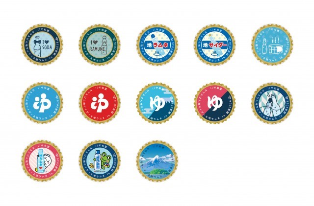 コラボバッジは、ガラスびんの象徴ともいえる王冠をモチーフに「ガラスびん」、「地サイダー&地ラムネ」、「銭湯」や東京、大阪両組合の公認キャラクターがデザインされた全13種。