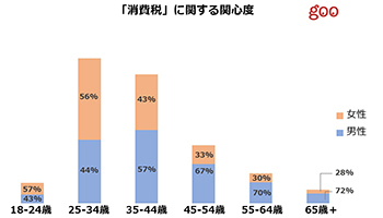 世代別では、1位が25~34歳、次いで2位が35~44歳、3位が45~54歳になったという。25~34歳は、結婚、出産、育児などのイベントが他世代と比べて多い年代で、家計に直結する消費税に強く関心を抱いていたとのことだ。男女別では、18~34歳で女性が男性よりも関心が高く、35歳以上で男性が徐々に関心度が高くなるという。