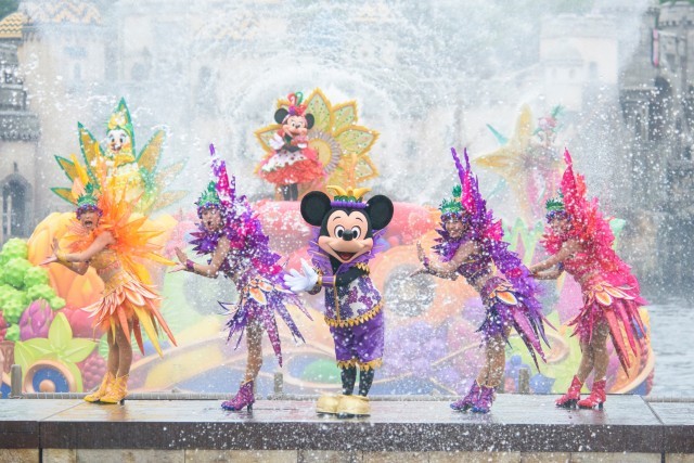 2015年度より、ミッキーは、グレープの柄が入ったノースリーブと短パンで、元気よく、大豊作のお祝いである「ミニーのトロピカルスプラッシュ」に参加しています。