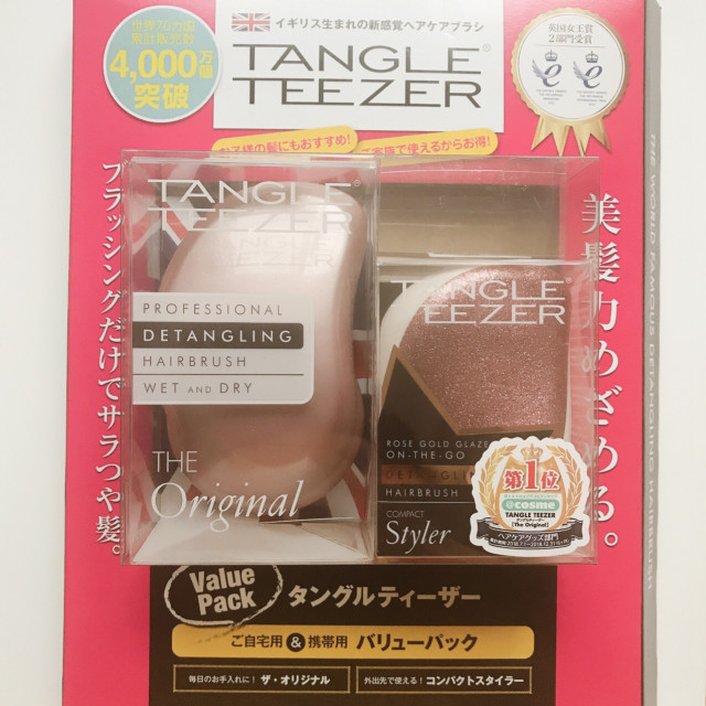 一番最初におすすめしてくれたのは、イギリス生まれのヘアケアブラシ『タングルティーザー』の2個セット。自宅用のザ・オリジナルと、携帯用コンパクトスタイラーのボリュームたっぷりのセット販売なんです。
