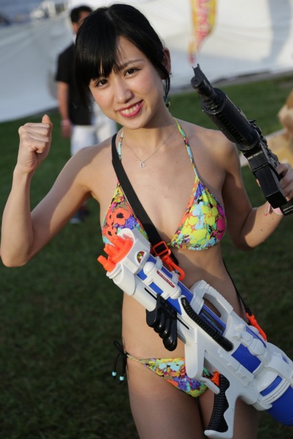 『夏の魔物』メンバーでもある塚本舞さんは、グラマーなスタイルとキュートな表情に、巨大水鉄砲という出で立ち。さすがグラドル横丁のキャプテン!