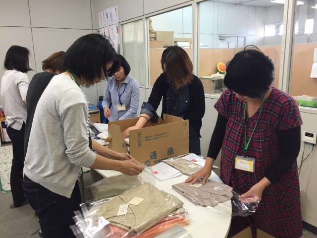ひとつひとつ気持ちを込めて授乳アイテム&メッセージを梱包中。支援物資は熊本県助産師会等を通じて現地のママたちの手に渡ります