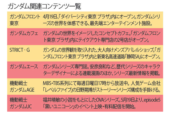 現在放送中のテレビシリーズ『機動戦士ガンダムAGE』では、従来のシリーズよりも低年齢層を意識した展開が行われている。国民的作品と成り得た今も、貪欲にファン層拡大を狙い続ける『ガンダム』は、更なる広がりを見せそうだ。