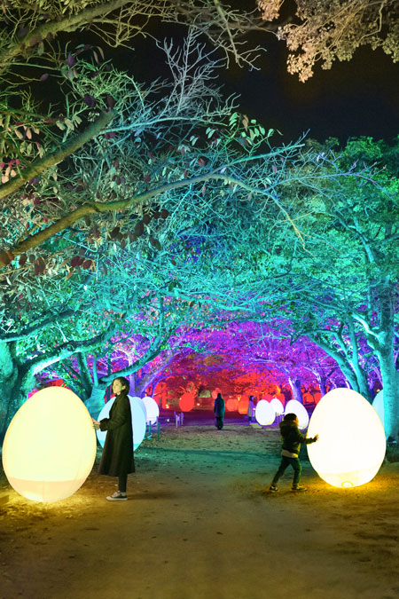 会場でまず目にするのは、2年前の開催時にも好評だった、木々がライトアップされた「呼応する木々」と卵状の光るオブジェの数々。花と動物が形を変えながら映し出される全長60m、高さ約10mの大天守台の石垣は今回も見どころのひとつ。そして今回、紙に描かれた黒田官兵衛ら歴史上の人物が命を吹き込まれて動き出す「お絵かき黒田官兵衛」や、光で描かれた黒い八咫烏(やたがらす)が大天守台跡の石垣を飛び回る「石垣の追われるカラス、追うカラスも追われるカラス - 石城大天守台跡」など、計4つの新たな作品も加わり、合計7作品が展示される。