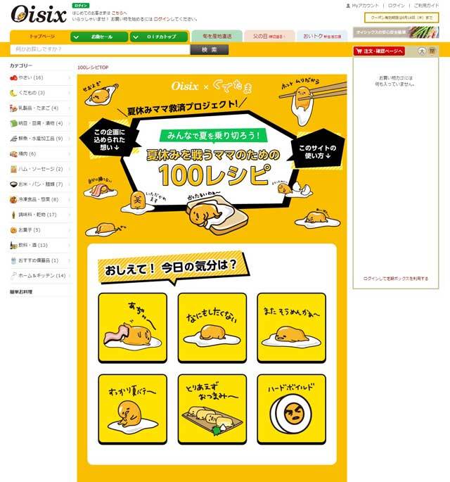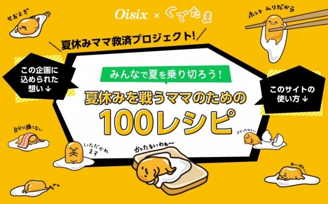 Oisix.comにて、サンリオの人気キャラクター「ぐでたま」とコラボした「夏休みを戦うママのための100レシピ」が7月28日から8月31日までの期間限定で公開。