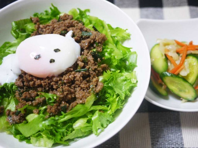 完成! シャキシャキレタスと味付けそぼろ、温たまが絶妙のハーモニー♪