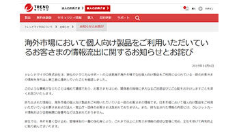 トレンドマイクロは、公式サイトのお知らせページに「海外市場において個人向け製品をご利用いただいているお客さまの情報流出に関するお知らせとお詫び」を掲載。発生した問題について陳謝しながら、「本件を重く受け止め、管理体制の一層の強化等により、これまで以上にお客さま情報の適切な管理に努め、全社を挙げて再発防止に取り組んでまいります」としている。