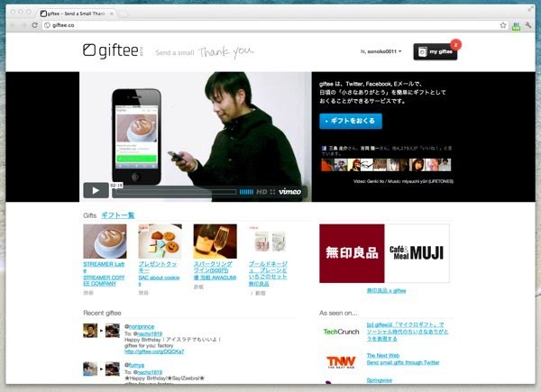 Facebook、Twitter、メールなどで日頃の「小さなありがとう」をギフトとして贈るサービスです。この“ささやかな感謝”がポイントで、1000円以内のギフトが多いため、受け取る側も贈る側も気張らない誕生日プレゼントとして最適。ギフトの例は主に都心にあるカフェのドリンクやデザートなど。贈り主はまずギフトの送信方法(Facebook、Twitter、メールのいずれか)を選び、贈る相手を決めて、何を贈るかを選び、ギフトカードに入れるメッセージを入力します。最後にカードで決済して終了。その後相手のFacebookやTwitterなどに「××さんから●●が届いています」という通知が来ます。相手の行動圏内にあるお店を選ぶのがベスト。自分の行くお店やお気に入りのお店などを、ソーシャル上にシェアしている人も多いので、そういった情報を参考に贈ってあげると、かなり喜ばれそう。ギフトの使い方も簡単で、受け取ったギフトカードをお店で提示し、店員さんから聞いた暗唱コードを入力するだけでOK。誕生日の2ヶ月以内が期限だということだけ注意して。