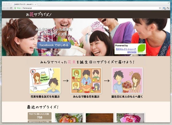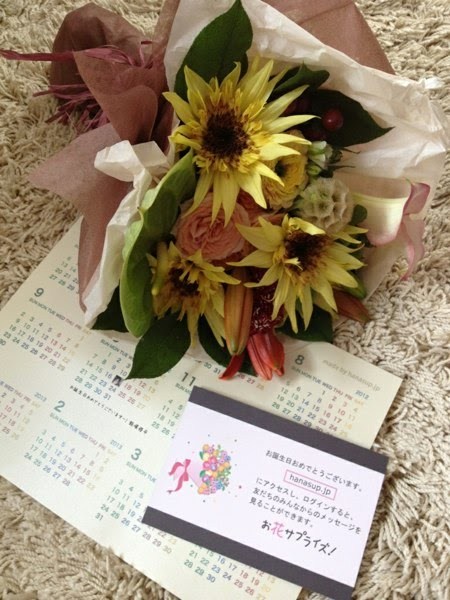 その名の通り、みんなで花束を準備して、サプライズで贈るサービスです。Facebookを使っている人であれば、誰でも利用できます。サイトへFacebookアカウントでログインすると、誕生日の近い友人がずらりと並んでいます。その中から花束を贈りたい相手を選択し、贈る花の種類や数を決めていきます。お花は1本400円とお手頃。誕生日当日が締切で、締切前であれば何度でも変更・キャンセル可です。直前まで悩んで最高な花束を作りましょう。花束の最低本数は15本と決められているので、何人かを募りたいところですよね。そんなときはFacebookのウォールやメッセージなどで、他の友達に参加を呼びかけることができます。もちろん贈りたい相手には見えない、上手な仕掛けになっているのでご安心を。規定の本数以上のお花が集まったら、誕生日当日の夜に本人のFacebook上へ通知が届きます。その後本人が1週間以内に届け先を入力すると、皆で作った花束が贈り届けられるというしくみ。花束はメッセージカードと贈り主の顔が載ったカレンダーと一緒に届きました。本当にサプライズなお花です。