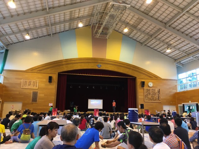 大会前日に雄勝入り。受付を済ませると、前夜祭は同じ会場内で開催されます。何やら会場内にはテーブルがたくさん配置され、スタッフの皆さんが準備を進めてくださっています。