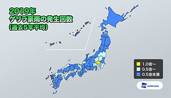ウェザーニューズは、2019年夏におけるゲリラ豪雨の発生回数と「ゲリラ雷雨まとめ調査」の結果を発表した。調査によれば、今シーズン(7月16日~9月30日)における全国ゲリラ豪雨の発生回数は合計1688回で、過去5年平均(4309回)と比較すると半分以下とのことだ。