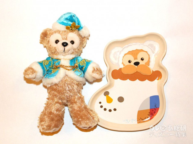 「ダッフィー&フレンズのウィンターホリデー」スーベニアプレートとぬいぐるみバッジの比較 ©Disney(撮影/ だふねこ)