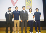 写真左より古賀幸一郎(豊田合成)、深津英臣(パナソニック)、Vリーグ機構嶋岡健治会長、佐藤美弥(日立)、竹田沙希(トヨタ車体)