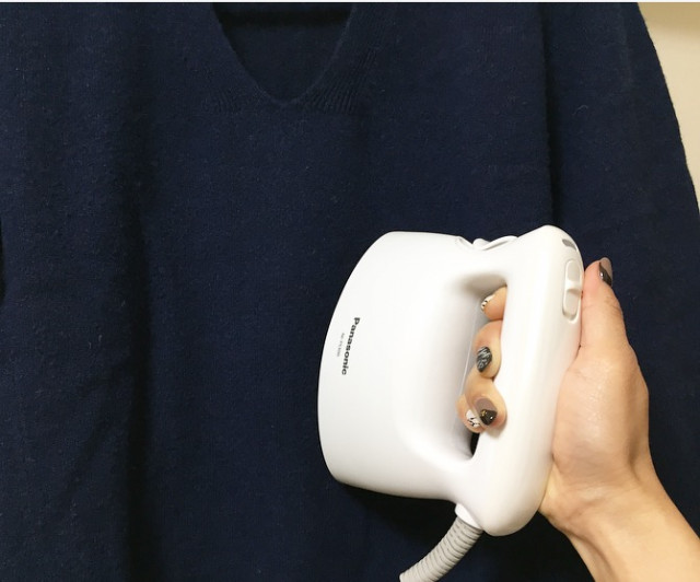 使っているスチームアイロンはパナソニックの『衣類スチーマー』。ハンガーにかけたまま、スチームをかけられるのでおすすめです。