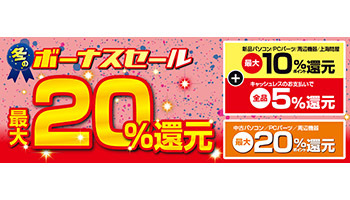 サードウェーブが運営するPC専門店のドスパラは、全国のドスパラ店舗と公式通販サイトで、大型セール「冬のボーナスセール」を11月28日まで実施している。期間中、ドスパラで買い物し、キャンペーンにエントリーしたモバイル会員に、購入金額の最大20%分のポイントを付与するキャンペーンだ。
