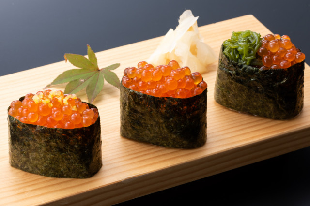 シンプルな「醤油漬けいくら軍艦」、柚子を利かせた「ゆずいくら軍艦」、昆布の旨味溢れる「めかぶいくら軍艦」の3種を一度に味わうことができます。