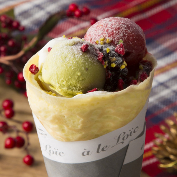 オープンからクリスマスまでの期間限定で、色鮮やかなグリーン(ピスタチオ)×レッド(フランボワーズ)のクリスマスカラーのジェラートをトッピングしたクレープ「ノエル」が登場。