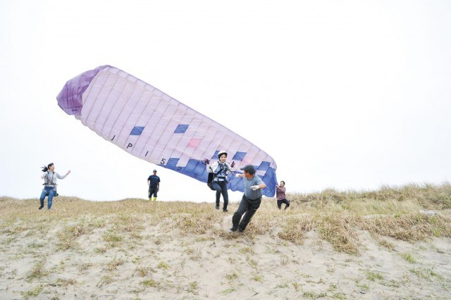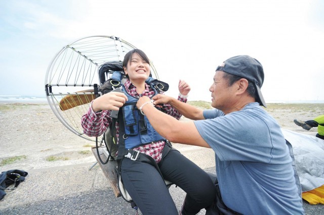 プロペラとパラグライダーを背負ったインストラクター・片岡さんと砂浜を走り、合図にあわせて地面を蹴ればふわりと体が宙に浮く…。