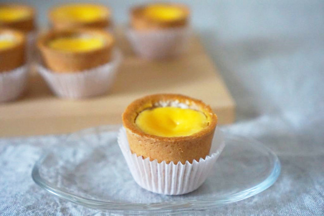 サクッとしたクッキータイプのタルトカップに、クリームチーズを流し入れ、表面に卵黄を塗ってからオーブンで焼き上げられた、焼きカップチーズ。