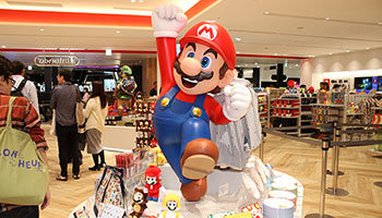 ニンテンドートウキョウにいた任天堂の広報の担当者は、「任天堂の世界感を楽しんでもらいたい」と出店の狙いを語る。店舗の外壁には、人気キャラクターのイラストなどが描かれており、外から見ても中から見てもワクワクする売り場づくりになっている。また、外周路の6階にはドット絵の懐かしいマリオのスタチューを設置しているので、要チェックだ。