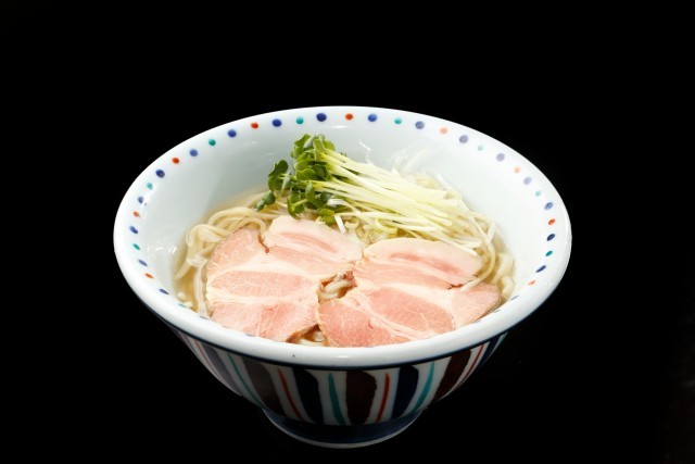 地鶏と丸鶏などのこだわり食材を中心としたWスープに、4種の塩をブレンドした特製塩だれがたまらない冷やし塩ラーメン。華やかに香るトリュフオイルが、上質なラーメンを彩る逸品。