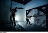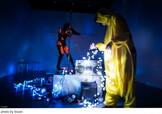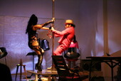 メガネさんの発電装置は、ポールを回すことで生まれる摩擦を利用して発電するので、「普通のポールよりも重たい。負荷は十倍以上」とのことで、メガネさんはヘトヘトに。「回してみたい人がいたらどうぞ」との呼びかけに、観客もステージ上の発電装置に集まり、順番に回してみた。
