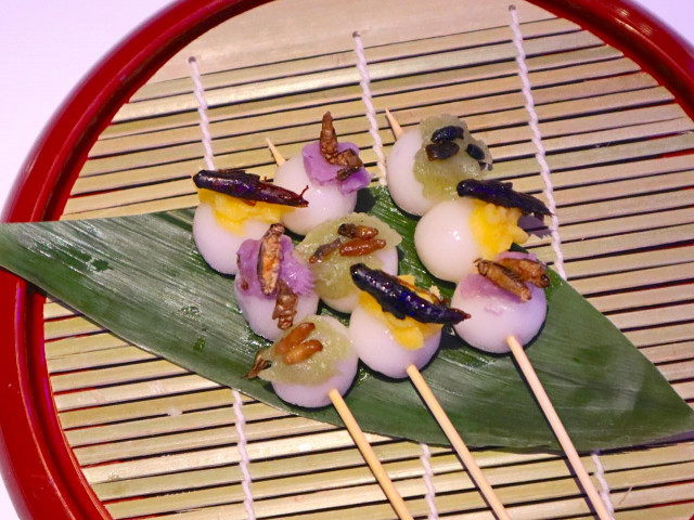 デザートには昆虫を組み合わせて提供しています。「MUSHIだんご」は、1串3つのだんごにクロレラ餡×カイコ、紫芋餡×コオロギ、カボチャ餡×イナゴをそれぞれ組み合わせてトッピング。季節や昆虫の仕入れによって餡と昆虫の内容が変わる中、色とりどりの華やかな見た目から、抵抗感が薄く、今後人気のメニューになりそうな予感です。