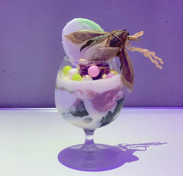 もうひとつオススメのデザートは「MUSHIパフェ」。トッピングされている大きなタガメが印象的ですね。グラスの中にはクロレラゼリー、クロレラホイップ、ブルーベリーのピューレ、お米のジュレ、アイスクリームが入っており、お米のパフやおいり、コオロギ、麩焼きをトッピング。