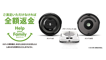 アイロボットジャパンは、公式オンラインストアや一部の家電量販店・オンラインショップなど、対象店舗で、ロボット掃除機「ルンバ 643/e5」または床拭きロボット「ブラーバ ジェット m6」を購入後、製品に満足できなければ、購入翌日から30日以内なら購入代金を全額返金する「Help your Family キャンペーン」を11月22日から12月27日まで実施する。「いい夫婦の日」から、家事ストレスの軽減の一助にアイロボット製品を気軽に使って欲しいとしている。