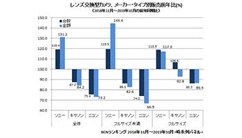 2018年11月から2019年10月までの1年間で、レンズ交換型全体の販売台数・金額の前年同期比を比較したところ、一眼レフとミラーレスを合わせたフルサイズカメラ全体で、ソニーは台数前年比118.9%、金額117.3%と2桁成長を維持している。追いかけるキヤノンは台数こそ106.6%と前年を上回ったが、金額では92.8%と前年割れ、ニコンに至っては台数・金額とも2桁割れに終わっている。ソニーに挑んだ2社ともに、急速に縮小するフルサイズ一眼レフをフルサイズミラーレスの投入でカバーできなかった。この結果、フルサイズカメラのメーカーシェアも、一眼レフが強いキヤノンから、ほぼミラーレスだけで戦うソニーが1位の座を奪い取った。