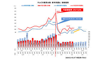 【BCN速報値】増税後の10月に入ってから、テレビ販売の足どりが重い。全国の主要家電量販店・ネットショップのPOSデータを集計した「BCNランキング」の速報値によると、11月第2週(11月11~17日)のテレビの販売台数は前年同週比97.7%と再び前年割れとなった。10月1日に消費税率10%が導入されてから同月第2週と第5週に続き、三度目の前年割れとなった。