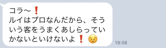 こちらが迷惑していることを伝えると「プロなんだからうまくあしらわないと!」や「そんなんじゃナンバーワンになれないヨ!」などと、急に叱ってくるのです。