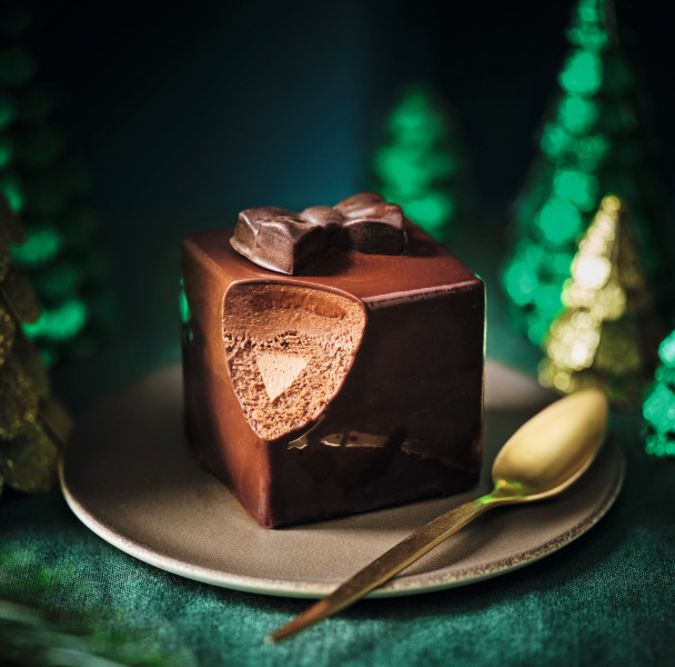 チョコレートのムース、ミルクチョレートのガナッシュ、カカオのビスケット、ゴマのクルスティアンを層に重ねたおひとりさまサイズのシックなケーキです。
