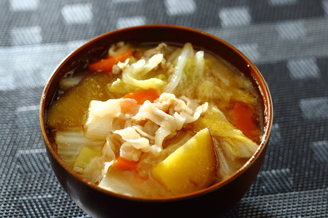 野菜たっぷりで、体も心もあたたまる豚汁は、日常を示しています。