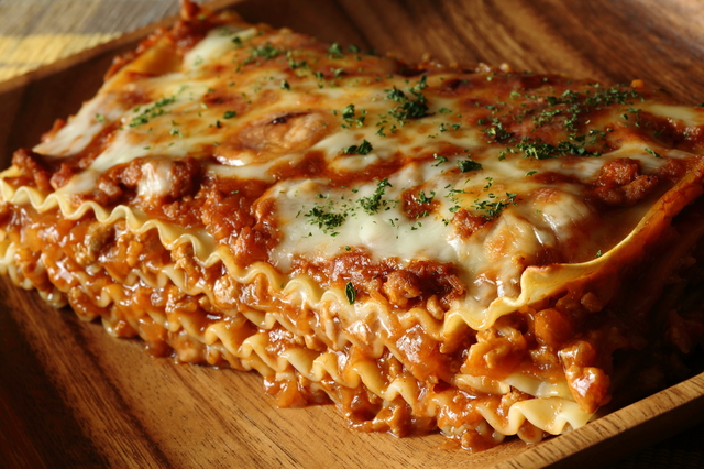 パスタとミートソースが層になっていてボリュームたっぷりなラザニアは、パワフルさを示します。