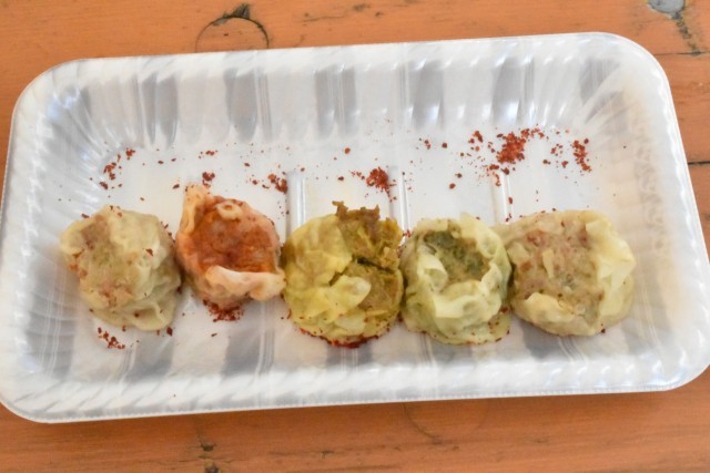 辛いうえに赤唐辛子が振ってある 右から【青唐辛子(ゆず胡椒)】【ハラペーニョ】【レモンドロップ】【ハバネロ】【辛富士】【青唐辛子(ゆず胡椒)】【ハラペーニョ】【レモンドロップ】【ハバネロ】【辛富士】の5種類の焼売。