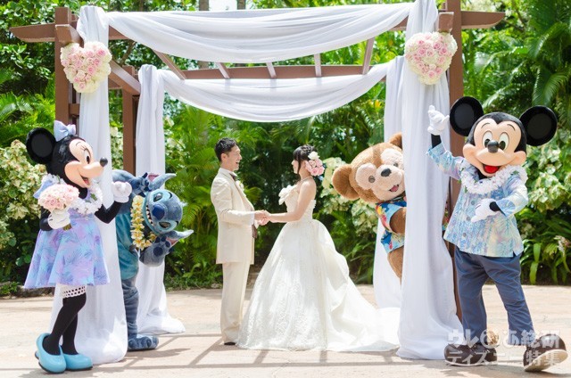 新郎の手を補助するミニーマウス、そして新婦の肩を支え、手を添えるミッキーマウス。