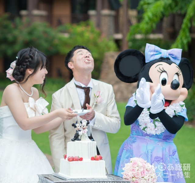 ミッキーマウスたちが見守るなか、ウエディングケーキ入刀。