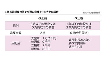なお、2019年6月公布、12月1日施行となる改正道路交通法では、運転中に「携帯電話を保持して通話したり画像注視したりした場合(保持)」の罰則として、新たに「6月以下の懲役」が設けられたほか、罰金はこれまでの「5万円以下」から「10万円以下」に、反則金は普通車なら従来の3倍(6000円→1万8000円)に、違反点数が3倍(1点→3点)にそれぞれ引き上げられた。