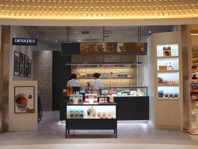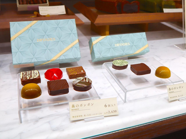 ナッツやカカオの実をはじめとする「木の恵み」がテーマのショコラトリー「DRYADES(ドリュアデス)」では、パリのピエール・エルメで就業経験のある斎藤拓野氏が木工職人と型作りから手がけたチョコが並びます。