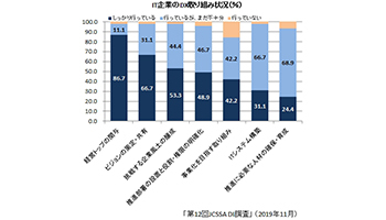 日本コンピュータシステム販売店協会(JCSSA)は11月29日、会員向けに実施した「第12回JCSSA景気動向調査」の結果を発表した。それによると、DX(デジタルトランスフォーメーション=デジタル技術を使った企業変革)に取り組んでいるIT企業のうち、9割近くが経営トップ自ら関与しているという実態が明らかになった。 DX関連ビジネスが会員企業の収益にどの程度寄与するかについては、「大いに寄与する」が27.8%、「ある程度寄与する」が47.9%で、合わせて75.7%と8割に届かなかった。DXへの取り組み状況については「すでに取り組んでいる」が31.3%(前回比+3.0、以下同)、「取り組むべく準備を進めている」28.5%(+0.2)と、徐々にDXに取り組む企業が増え始めている。